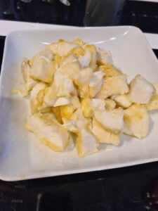 - Inzwischen gefrorenen oder frischen Kabeljau in ca. 3 cm große Stücke schneiden und in Mehl wenden. Die Stücke in einer Butter-Öl-Mischung von allen Seiten anbraten bis sie Farbe nehmen. Fisch rausnehmen und warmstellen.700 g TK-Kabeljau oder frisches Filet, Olivenöl extra nativ, Butter