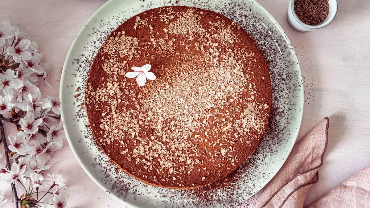 - Den Teig in die Form füllen und im Ofen ca. 22 min backen. Nach dem Backen in der Form auskühlen lassen und mit dem Kakao bestreuen. Wer mag, kann auch noch etwas Schokolade raspeln und die Torte damit bestreuen.2 EL Kakao