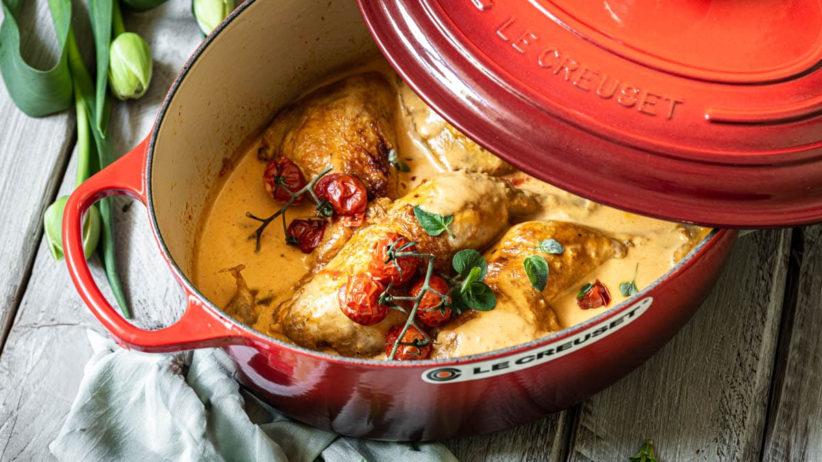 Unser geschmortes Huhn mit Ofentomaten in Cheddarsauce gelingt im schönen Bräter von LeCreuset zugegebenermaßen ganz besonders gut ?