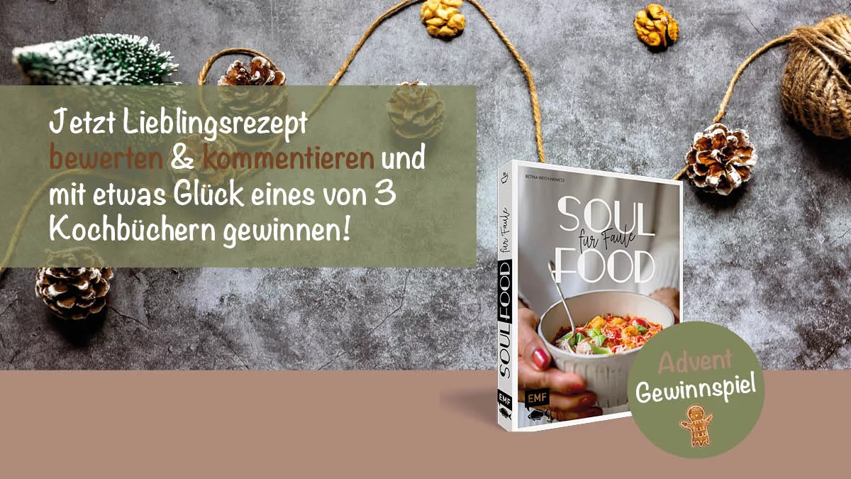 Unter allen abgegebenen Kommentaren und Bewertungen verlose ich 3 Exemplare meines Kochbuchs Soulfood für Faule.