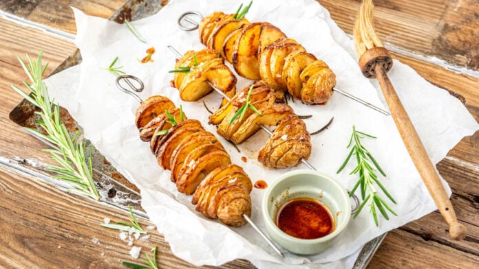 - Kartoffeln Es ist wichtig, dass du eine festkochende Sorte verwendest. Denn sonst fallen sie dir gleich vom Spieß und können die Form nicht halten. Außerdem sollten es Frühkartoffeln sein, die du mit der Schale verwenden kannst.