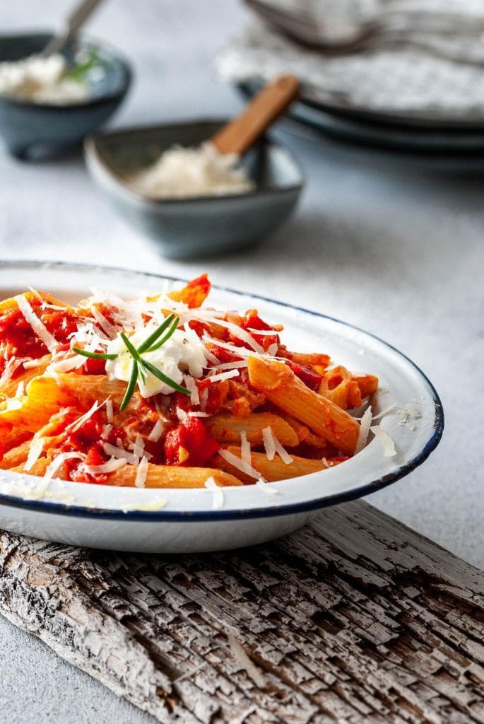 Die Verbindung von Penne, Tomaten und Ricotta ist ein Beispiel für eine Kombination, bei der sich die Eigenschaften der Zutaten ergänzen und hervorheben. Die röhrenförmigen Penne fangen Saucen und Zutaten wunderbar ein. Und die Tomaten fügen mit ihrer fruchtigen Säure und dem reichen Geschmack eine ausgeglichene Note hinzu. Der Ricotta wiederum bringt eine seidige Cremigkeit mit einer leichten Milchsüße ins Spiel. Ein wunderbares Zusammenspiel.