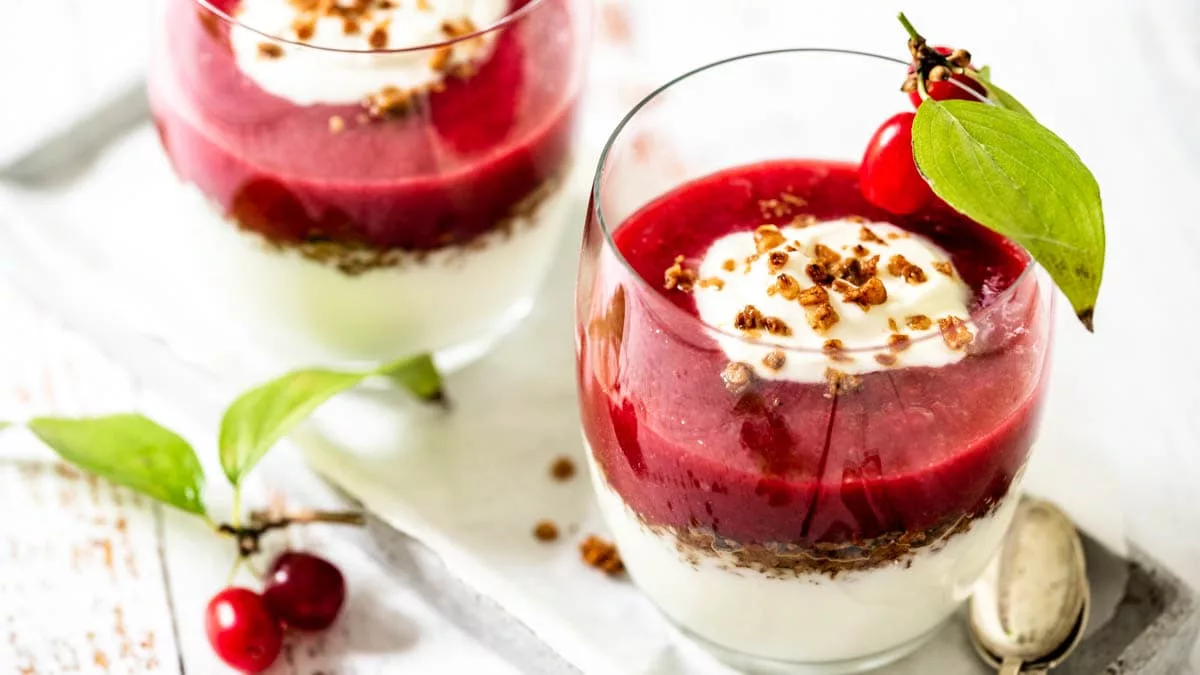 Schichtdessert aus Kornelkirschen Fruchtmus, Joghurtcreme und Walnuss-Haferflocken-Crunch