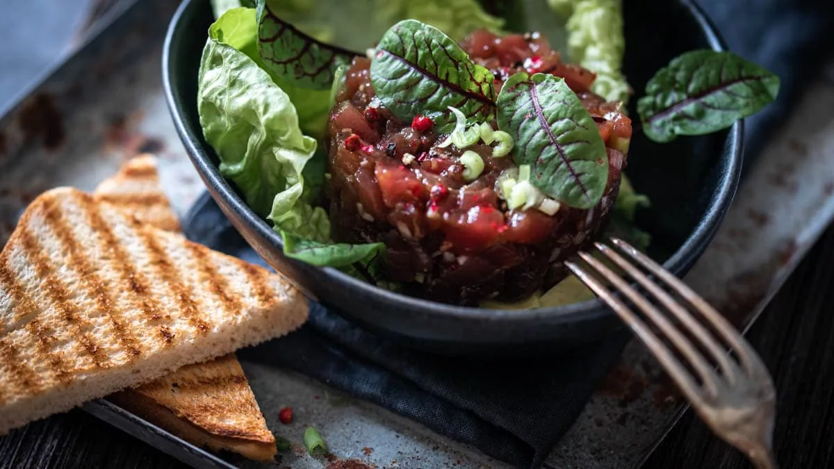 - Nachder Kühlzeit mit Salz und Pfeffer abschmecken. Den Salat waschen und trocken schleudern. Die Avocado klein würfeln und sofort mit dem Limettensaft vermengen, dann salzen und pfeffern. Die Salatblätter mit etwas Essig, Öl und Salz marinieren und mit dem Thunfischtatar und der vorbereiteten Avocado anrichten.Salz, 1 Stk. Avocado, 1 EL Limettensaft, 2 Handvoll gemischte Salatblätter, Essig, Öl, Pfeffer